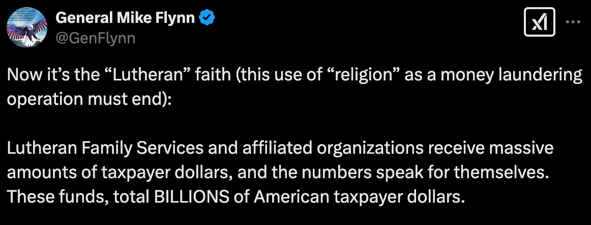 This is incredibly dangerous, of course. It’s an attempt to de-legitimize the work these fine Christian groups are doing. By throwing out the phrase, “money laundering” General Flynn seeks to equate the ELCA with drug dealers or organized crime.